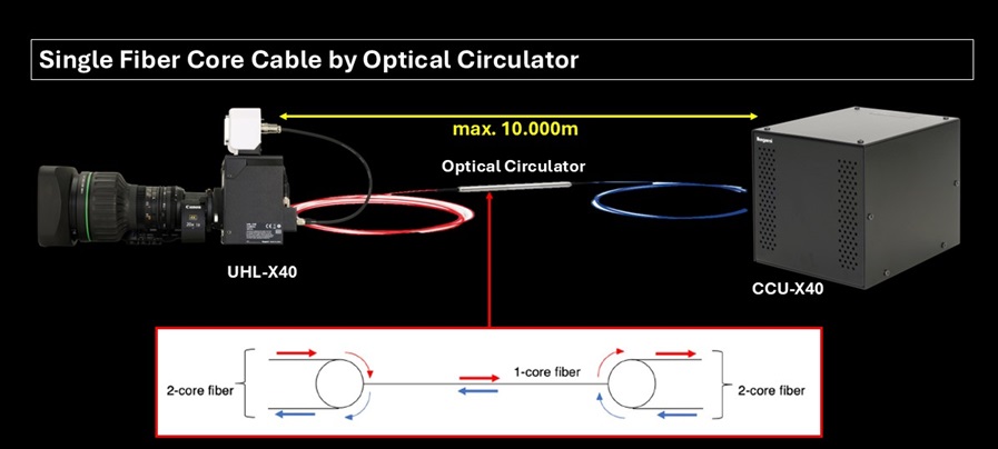 Connection from camera head to CCU-X40 is made by standard duplex SM (single mode) fiber cables, carrying the uncompressed 4K/UHD video signals plus a 1000Base-T Ethernet trunk channel. As such, PTZ control commands, script data or teleprompter signals can be transmitted simultaneously.
