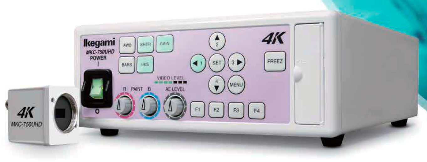 Ikegami's MKC-750UHD camera head accepts standard C-mount lenses and connects via up to 15 metres of medical grade cable to a 210 x 80 x 270 mm WHD mains-powered control unit. Technical parameters include 1/100 to 10,000 shutter speeds and a sensitivity of 2,000 lux at F8 in lighting levels of 3,200 K, or better, horizontal/video centring. A colour bar generator, seven-segment video level indicator, HDTV tri-level sync input and simultaneous 4K/HD outputs are provided. Camera and controller can be operated automatically and are rated for use across a temperature range of 0 to 40 degrees C. Both have an anti-bacterial coating as recommended for use in surgical environments. Power consumption is only 29 watts so the entire system runs cool.