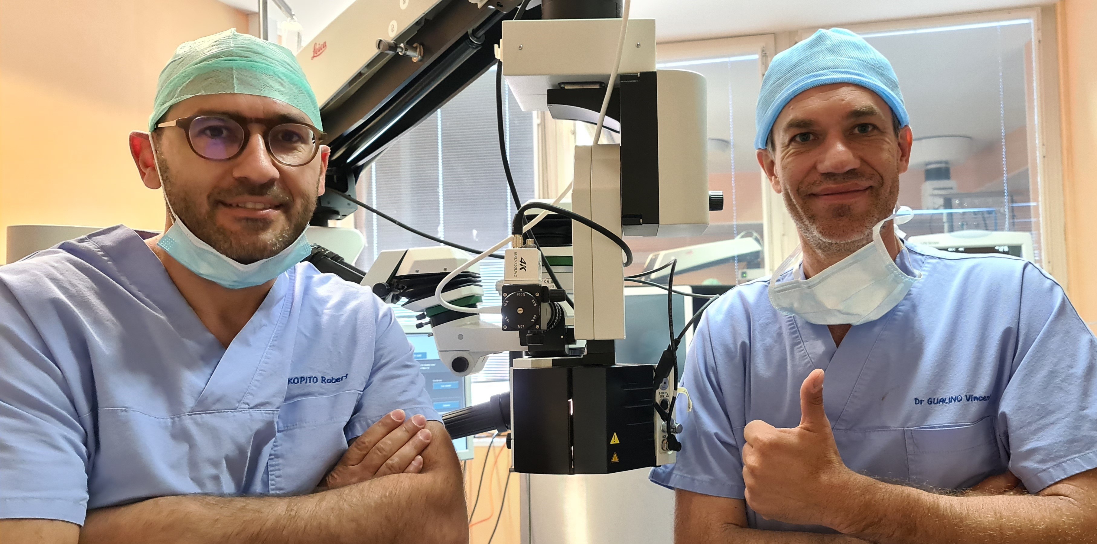Clinique Honoré Cave ophthalmologists Dr Robert Kopito and Dr Vincent Gualino with Ikegami MKC-750UHD compact lightweight 4K camera attached to a surgical microscope.